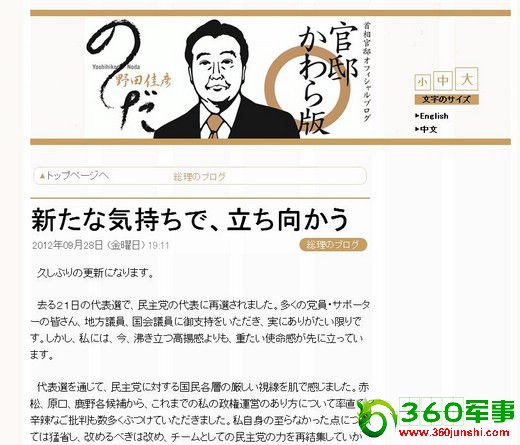 据朝日新闻报道,继联合国大会上中日双方就钓鱼岛唇枪舌剑的交锋之后,28日夜,日本首相野田佳彦更新自己的博客:“中日之间变成这种斗嘴争执的局面,实在很遗憾”,表现出对当日中方演说的不快感。